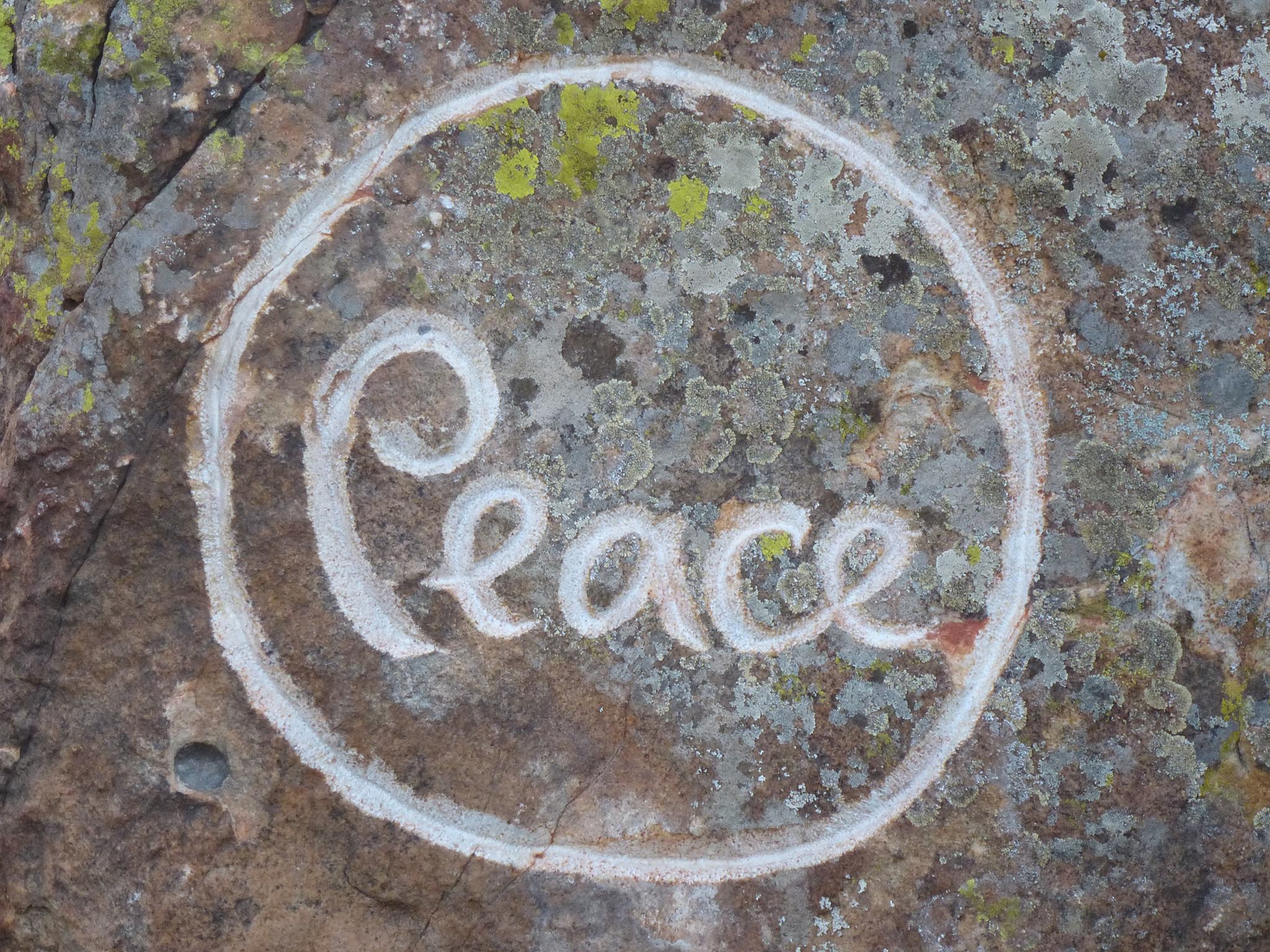 Engraving of “Peace” on a rock at Magnolia Grove Monastery