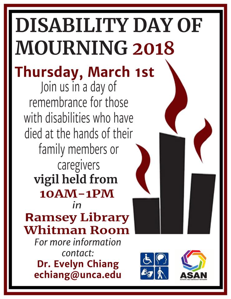 The Day of Mourning, an event remembering and honoring disabled people murdered by family members or caregivers, is held on March 1. Local vigils take place across the United States, as well as in Australia and Canada. In Asheville, North Carolina, vigils have been held at the University of North Carolina Asheville (UNCA) for the past two years.