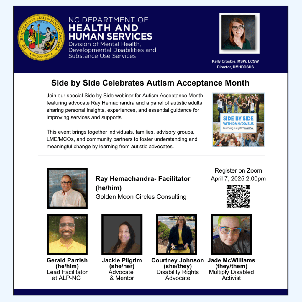 News flash! I am putting together and moderating a Monday, April 7 panel of brave and amazing autistic adults for Autism Acceptance Month, with thanks to Director Kelly Crosbie and her team at the North Carolina Department of Health and Human Services Division of Mental Health, Developmental Disabilities, and Substance Use Recovery Services.