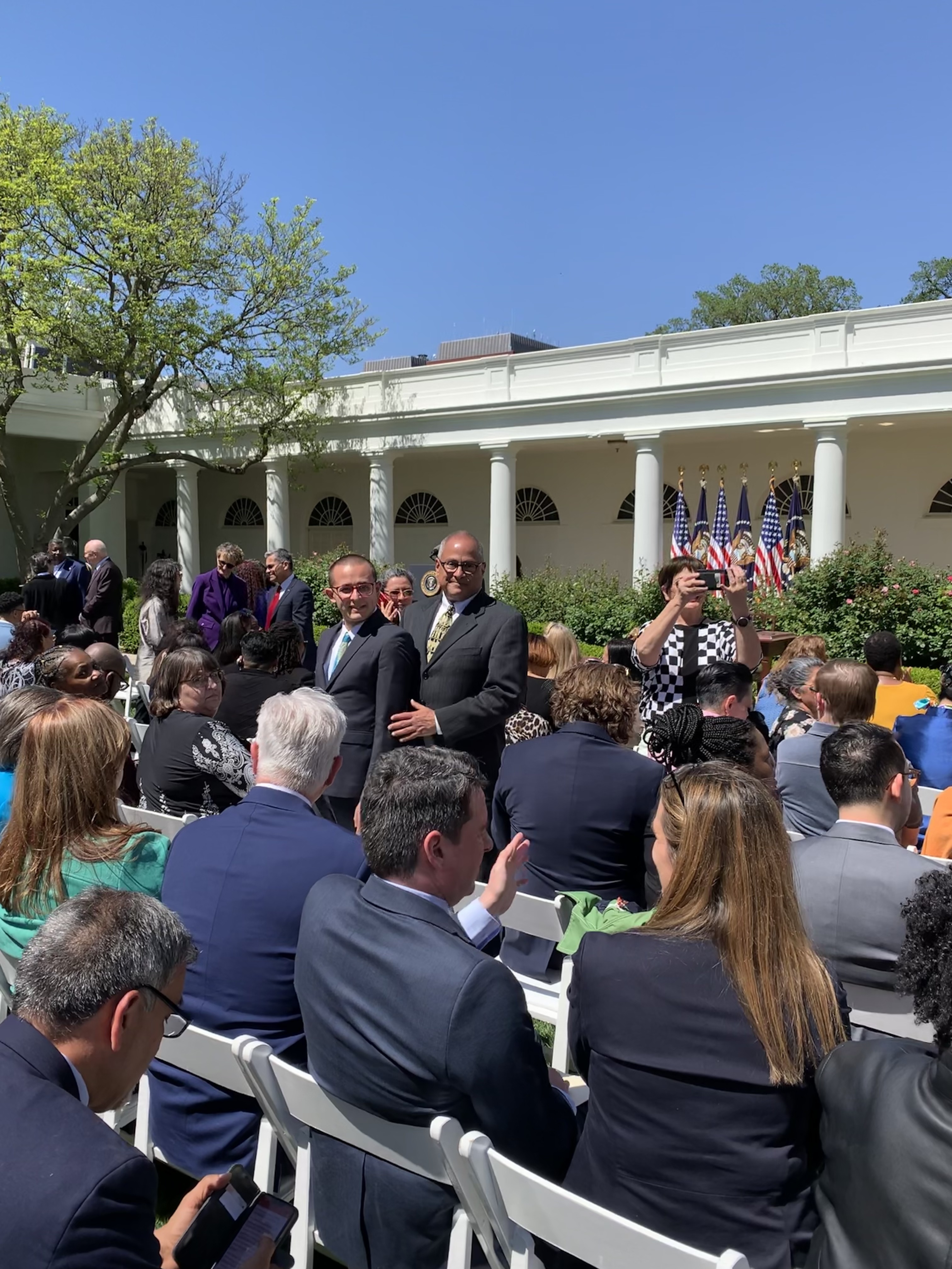 In suits and ties facing the camera: Nicholas Hemachandra and Ray Hemachandra in the Rose Garden on April 18, 2023, before President Biden delivered remarks and signed an Executive Order in support of American care workers and caregivers and the people in their care. (Photo by Julie Ward)