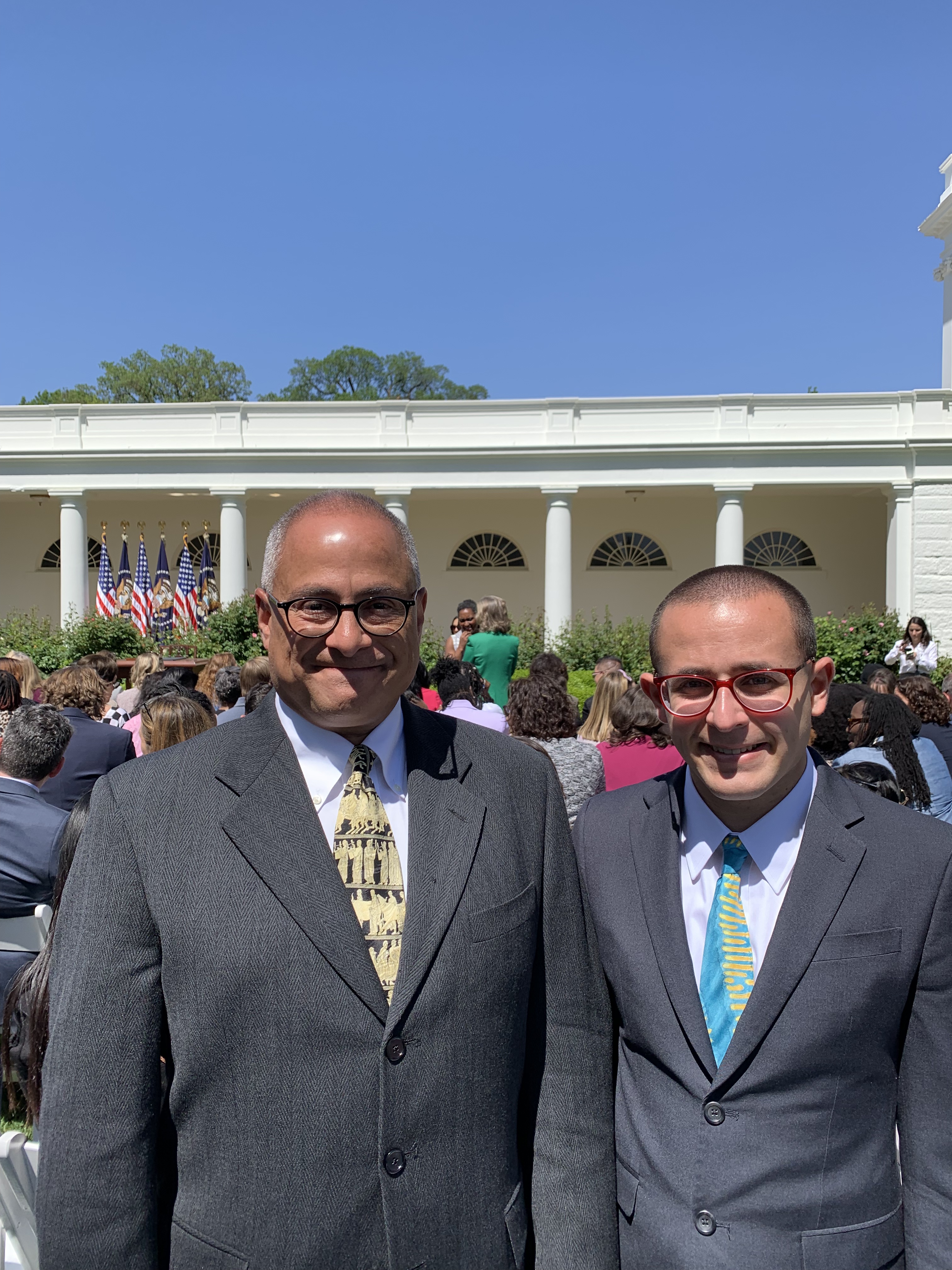 Ray Hemachandra and Nicholas Hemachandra in the Rose Garden before President Biden's remarks.